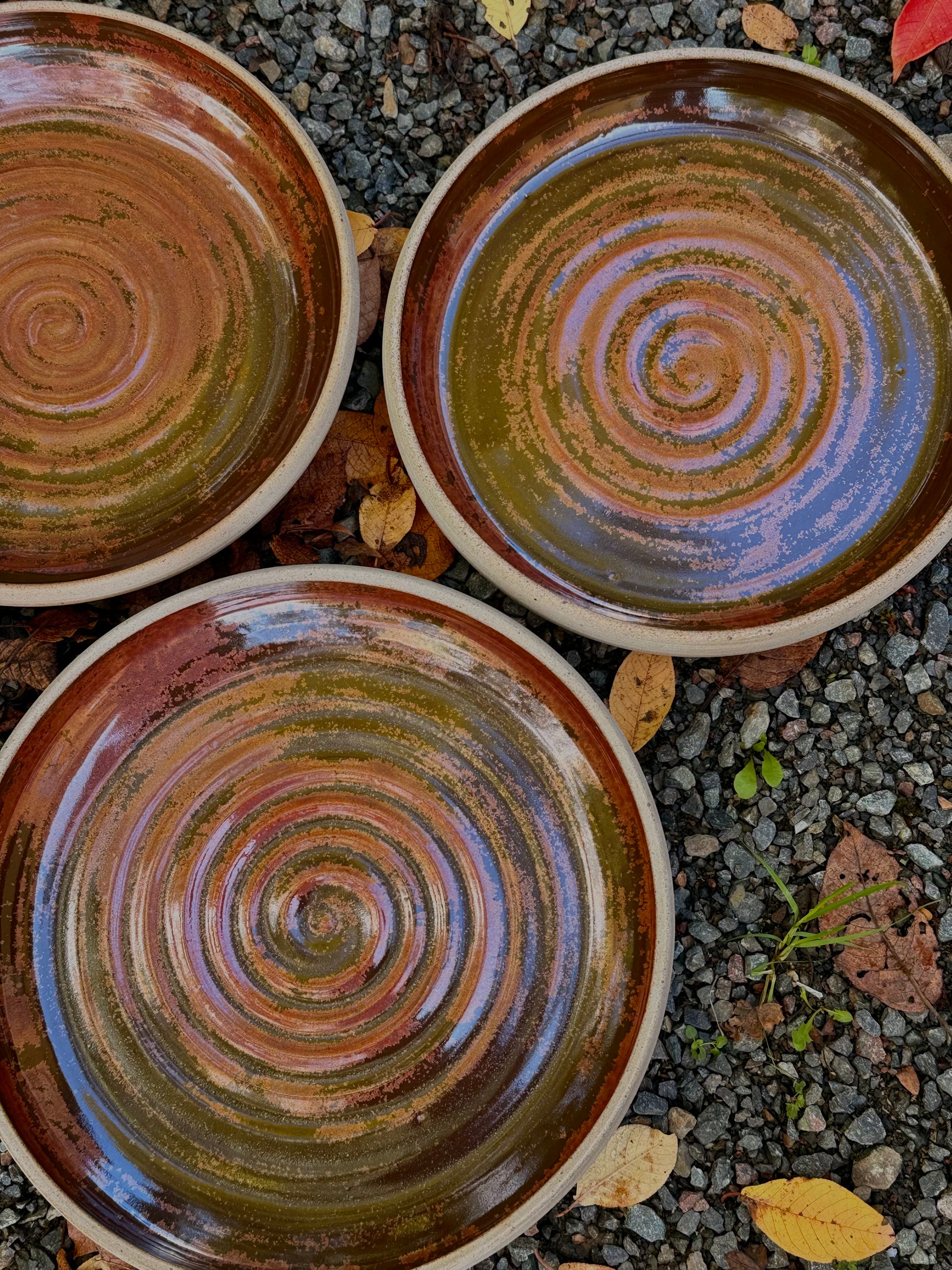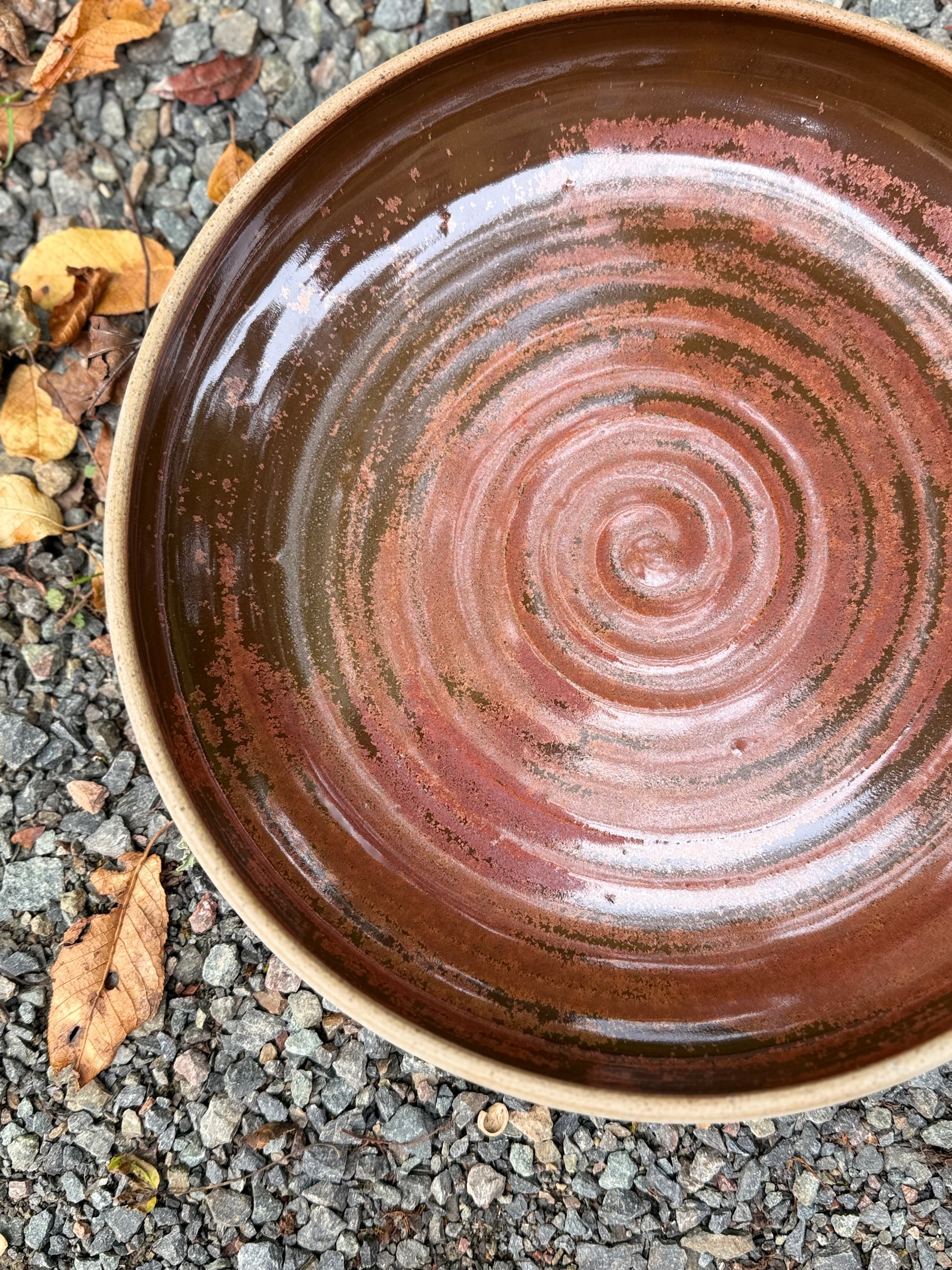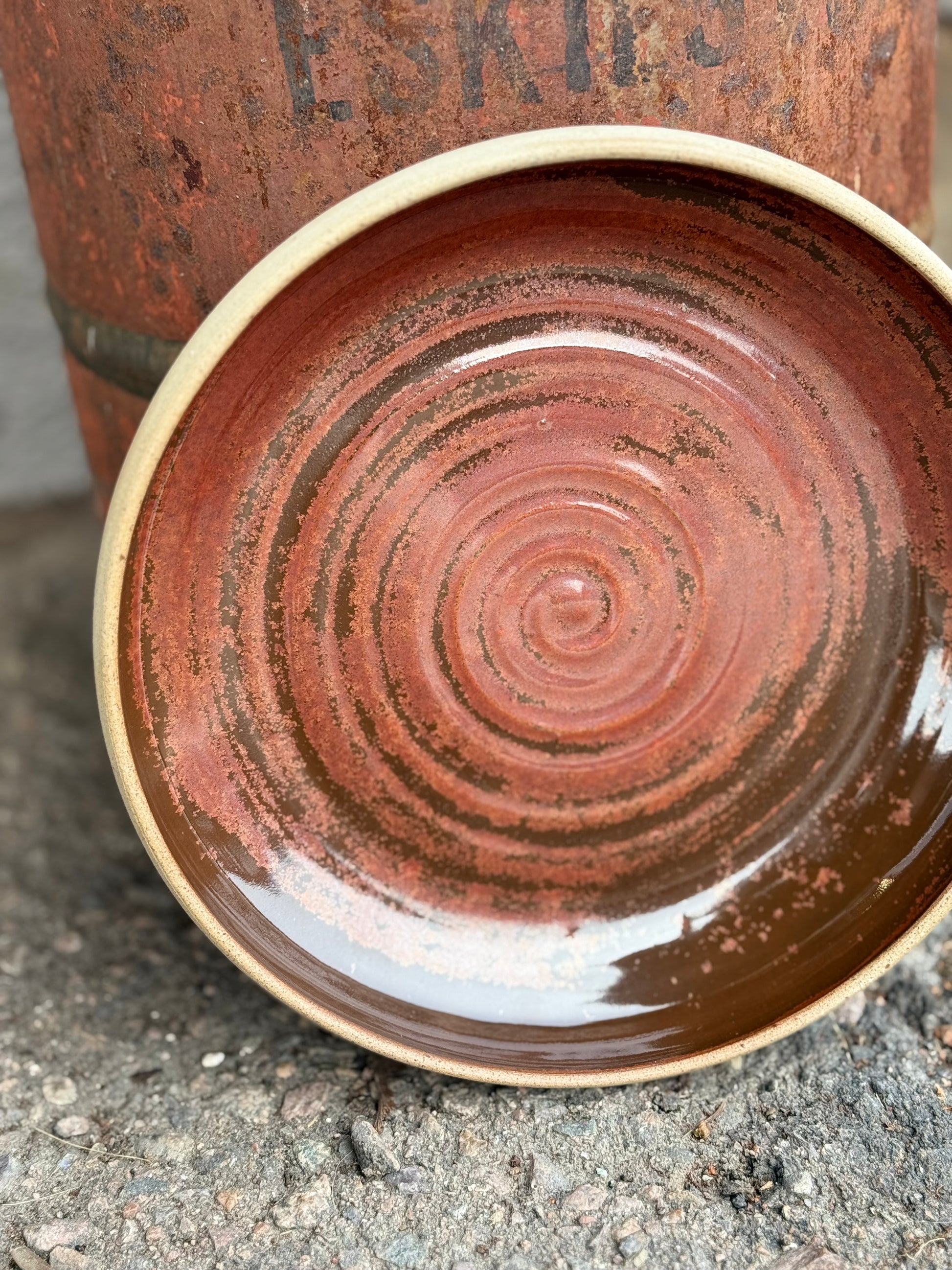 Fat med rundad kant med vinröd/brun melerad glasyr.