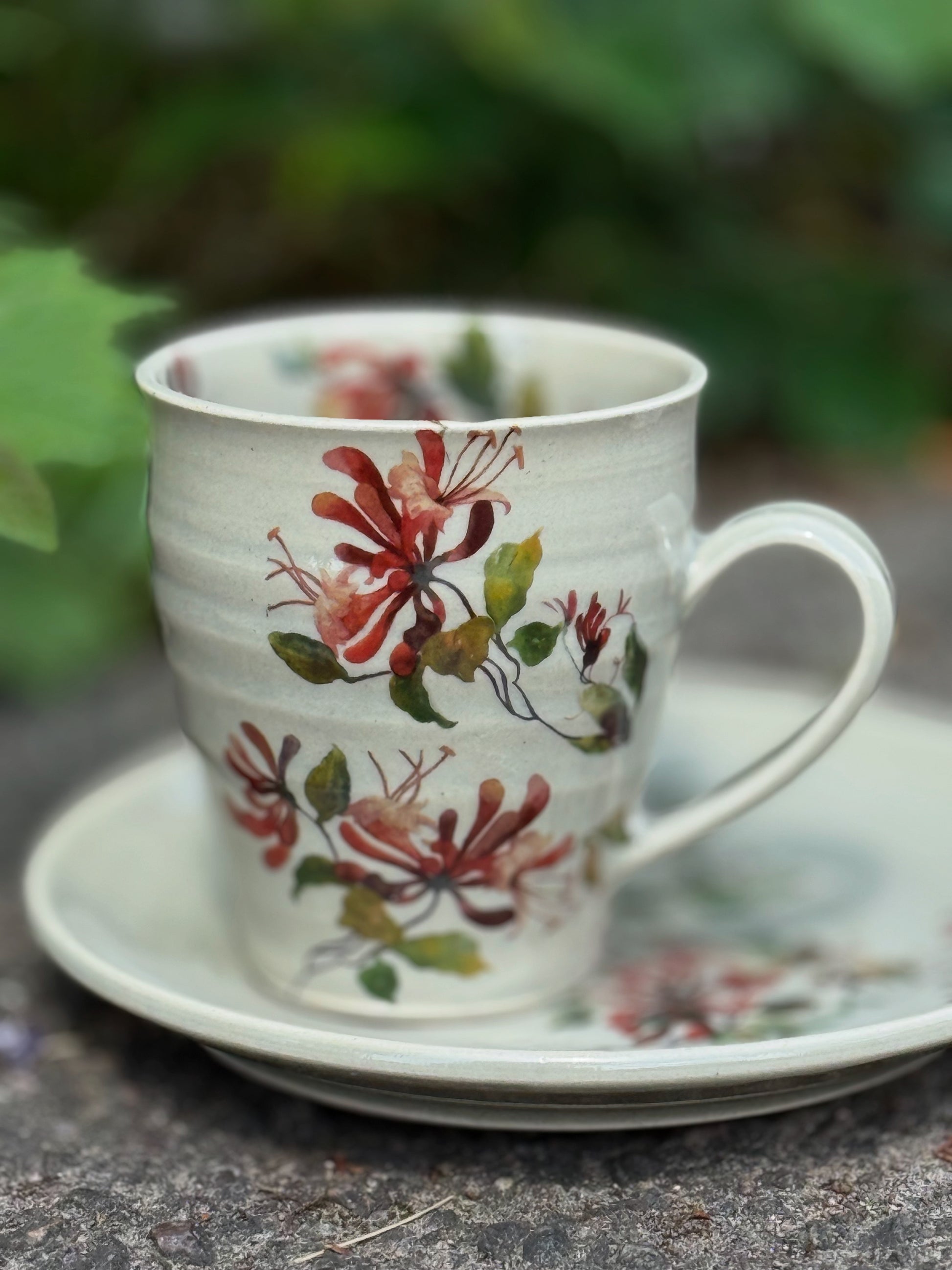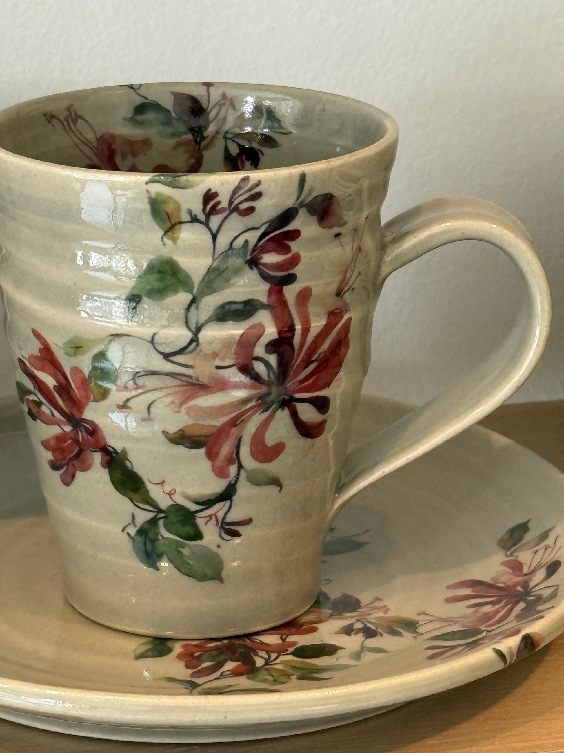 Kopp i ljusgrå glasyr med kaprifol. Rymmer ca 3 dl, drejad i vit lera. Tål maskindisk och micro